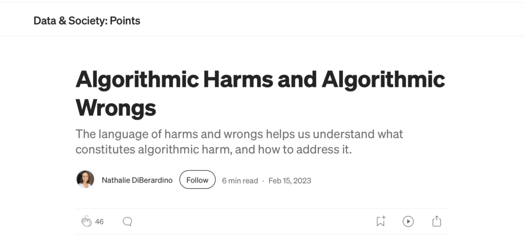 Now, is this a harm? In their paper, Nathalie DiBerardino and our very own Dr. Luke Stark argue that AI ethics need to distinguish between “harm” (as distinctly negative outcomes), and “wrongs” (as a violation of rights or relational equality). As a data harms researcher, I agree there also needs to be a distinction along these lines. What my colleague described aren’t necessarily harms or wrongs, but hidden among them are the foundations or the potentiality for them. It is this potentiality that does a disservice to libraries and those who use them.