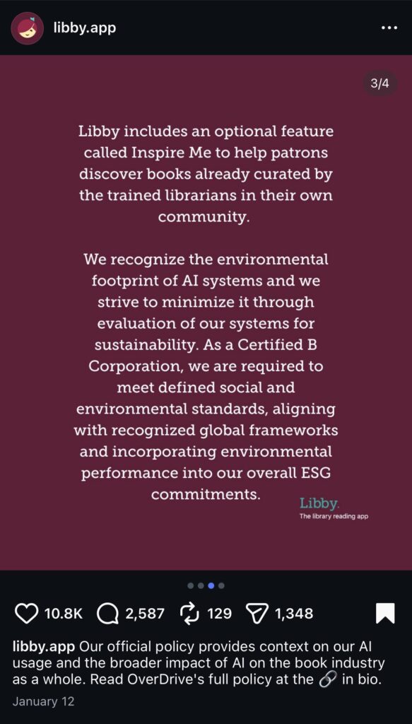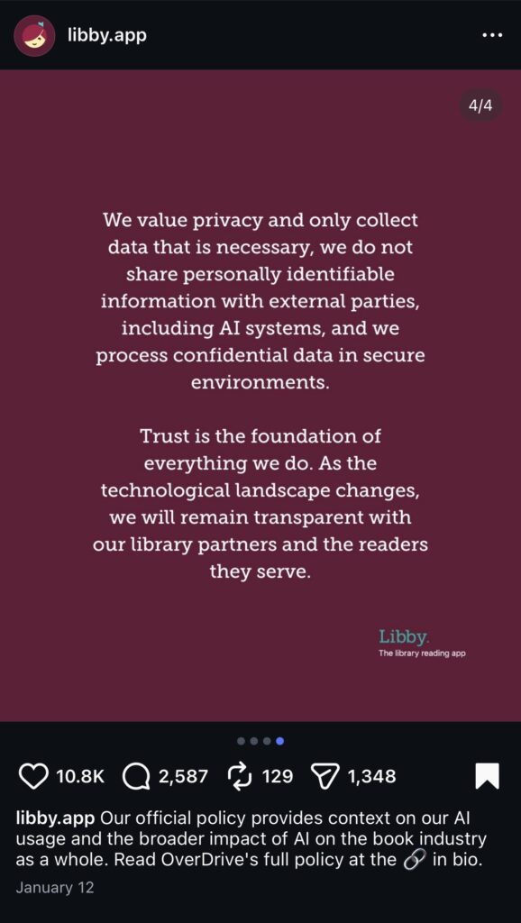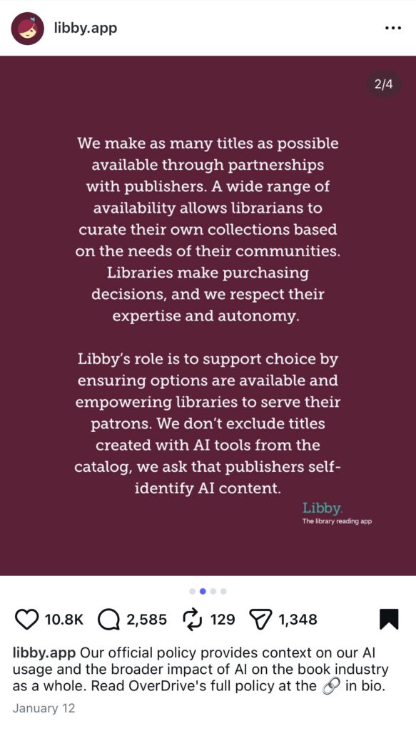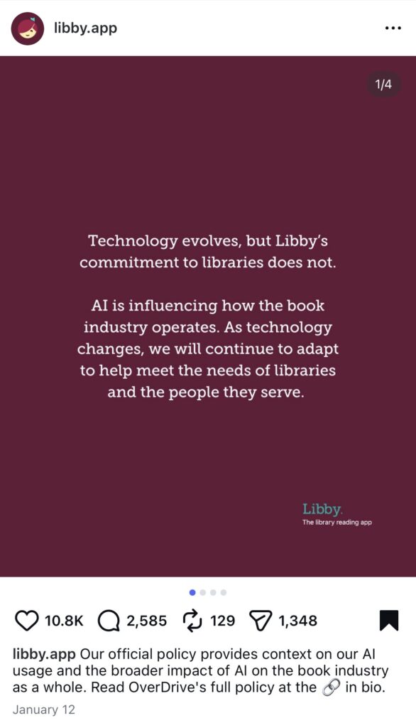 Three months ago, Libby announced on their official Instagram account that they were committed to implementing new artificial intelligence features as they became available. The app claimed they would allow AI-assisted texts on their platform, provided authors clearly disclosed when AI was used. This announcement also received negative reception. Users argued that Libby’s decision was a “bold” move and that self-disclosure of AI-assisted texts was not an effective means of regulation. Many users also worried about what the app’s next moves might be as more AI features became available.