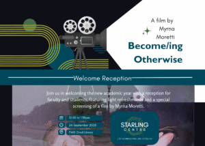 The Starling Centre welcomes faculty and students to a welcome reception at the FIMS Grad Library on 24 September 2025. We will be screening a film by Dr. Myrna Moretti, a Starling Post-Doc, called, “Become/ing Otherwise”. Light refreshments will be served. Details at a Glance: Where: FIMS Grad Library, 2nd Floor, FIMS & Nursing Building […]